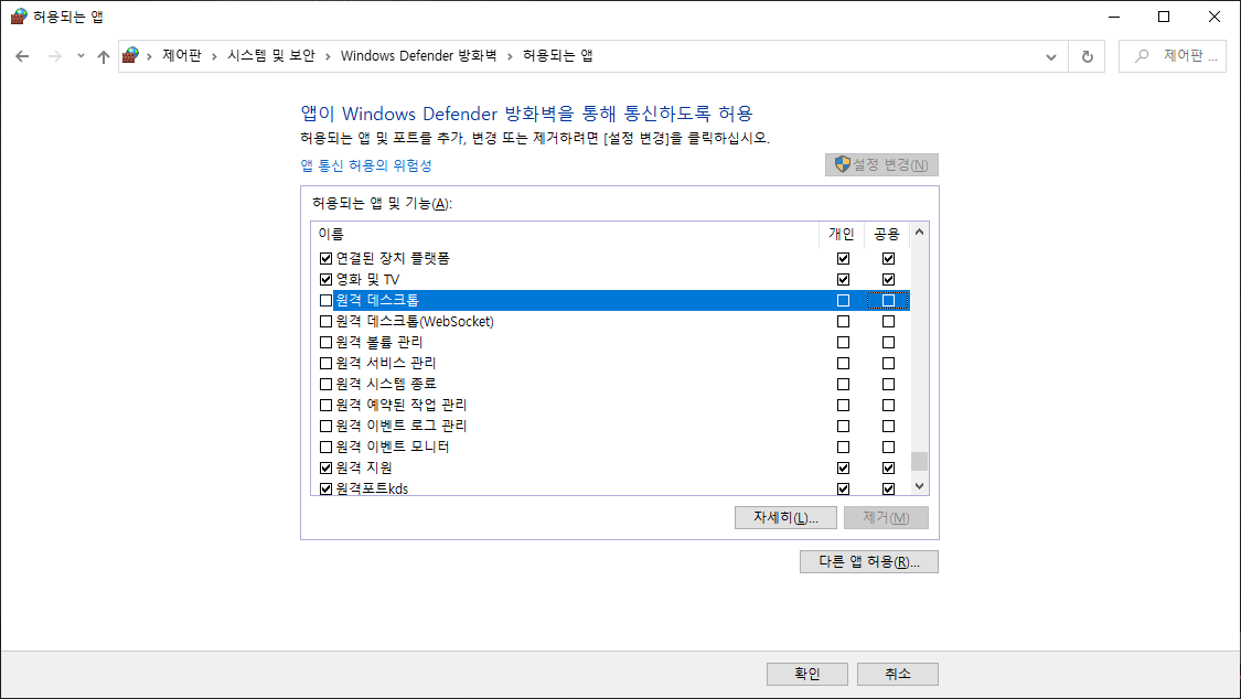 원격 데스크톱 을 찾아 체크를 해제 합니다. 체크 해제가 안될때 설정변경 버튼을 클릭 후 해제를 해보세요.