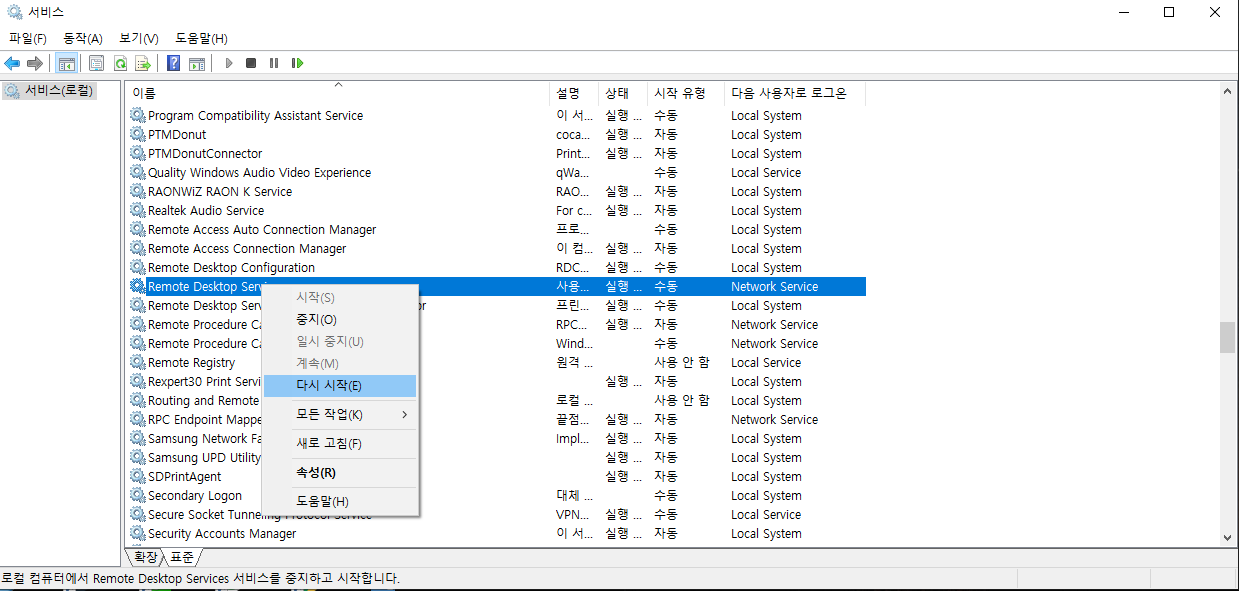 서비스 에서 remote Desktop Services 를 찾아 마우스 오른쪽 버튼을 클릭하여 다시 시작(E)를 실행합니다.