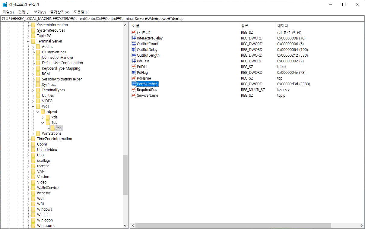 컴퓨터\HKEY_LOCAL_MACHINE\SYSTEM\CurrentControlSet\Control\Terminal Server\WinStations\RDP-Tcp