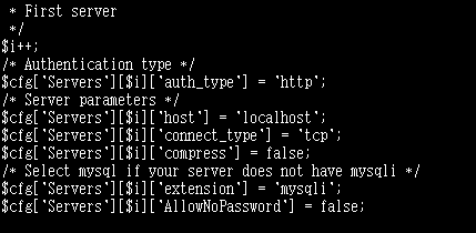 $cfg['Servers'][$i]['auth_type'] = 'cookie'; 의 cookie를 http로 변경합니다.