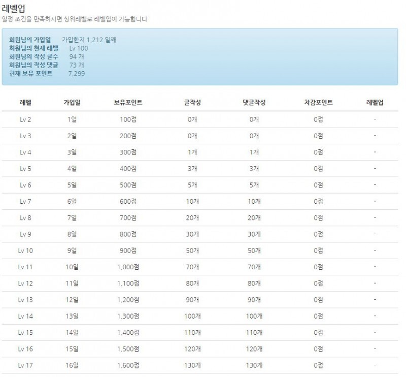 레벨업 일정 조건을 만족하시면 상위레벨로 레벨업이 가능합니다 회원님의 가입일 가입한지 0 일째 회원님의 현재 레벨 Lv 회원님의 작성 글수 0 개 회원님의 작성 댓글 0 개 현재 보유 포인트 0