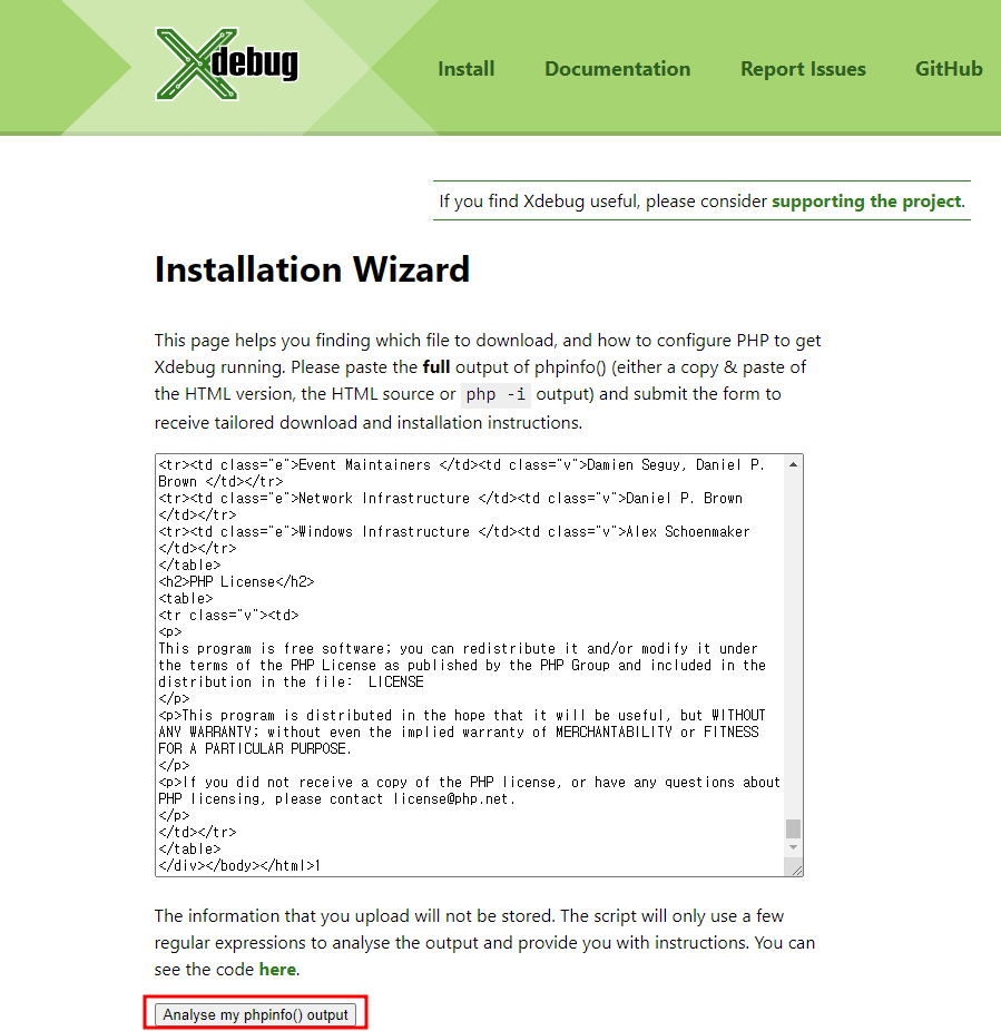 Installation Wizard This page helps you finding which file to download, and how to configure PHP to get Xdebug running. Please paste the full output of phpinfo() (either a copy & paste of the HTML version, the HTML source or php -i output) and submit the f