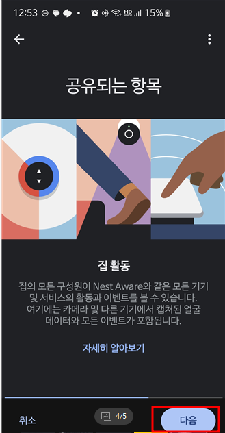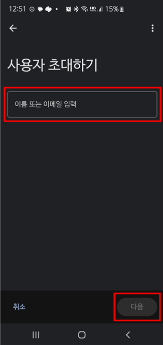 다음 화면의 '집 구성원" 을 선택하면 "사용자 초대하기" 화면이 나오면 초대하고자 하는 가족원의 이메일 주소를 입력하고 '다음' 을 터치합니다.