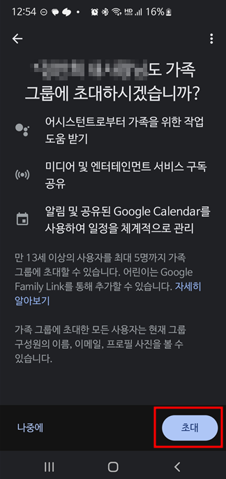 메일을 받은 가족이 수락하면 초대가 완료된다.