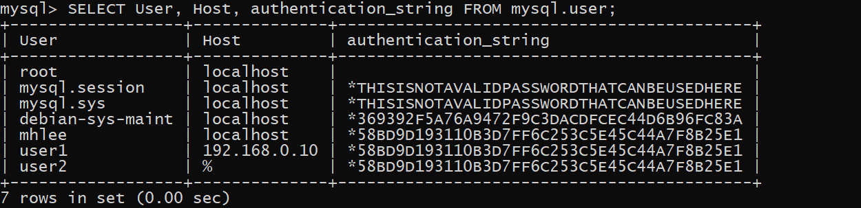 생성 했던 mhlee, user1, user2 계정이 잘추가 되었는지 확인해줍시당.